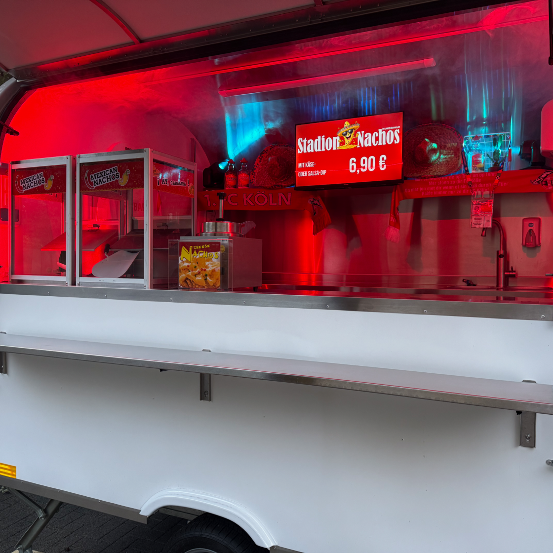 Die mobile Snackbar „Stadion Nachos“ ist der perfekte Eyecatcher auf Events, Festivals, Messen oder Sportveranstaltungen. Die mobile Snackbar steht bei den Heimspielen des 1.FC Köln vor dem RheinEnergie Stadion.
