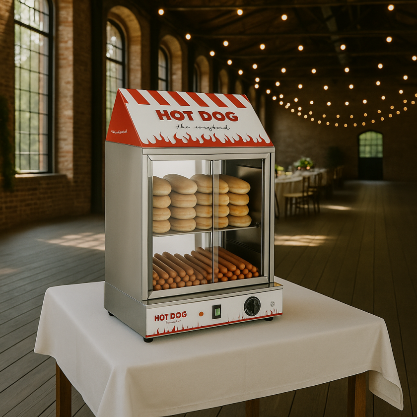 Mit unserem leistungsstarken Hotdog-Wärmer servieren Sie im Handumdrehen frisch erwärmte Hotdogs – ideal für Events, Partys oder Firmenfeiern. Das Gerät bietet Platz für ca. 50 Brötchen und ca. 100 Würstchen, die gleichmäßig warmgehalten werden. Dank der kompakten Bauweise, einfacher Bedienung und hygienischer Glastüren ist der Hotdog-Wärmer sowohl funktional als auch ein echter Hingucker.