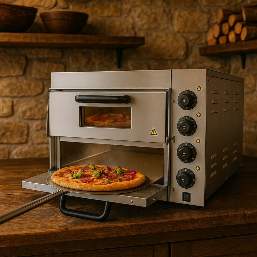 Mit einer Leistung von 3000 W (230V) und einer Höchsttemperatur von 350 °C sorgt der Ofen für perfekt gebackene Pizzen mit goldbraunem Boden und aromatischem Belag.