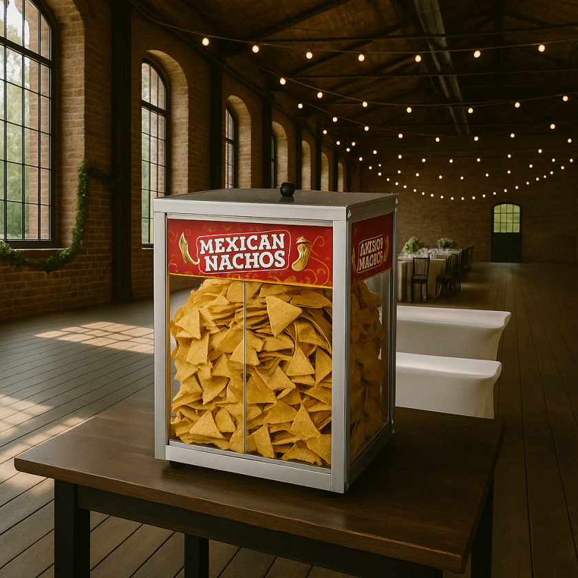 Mit unserem Nacho-Wärmer präsentieren Sie Ihre Snacks nicht nur optisch ansprechend, sondern halten sie auch perfekt warm und knusprig. Das Gerät bietet großzügigen Stauraum für große Mengen Nachos und eignet sich ideal für Partys, Kino-Events, Messen oder Firmenfeiern. Durch die transparente Front sind die Nachos immer sichtbar – ein echter Blickfang, der Appetit macht.